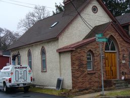 Custom Gothic Style wood storm windows hand-fabricated for a Historic Residential Property located in Doylestown Borough, circa 1887. The beauty of the original stained glass sashes is not obscured by the storm units.